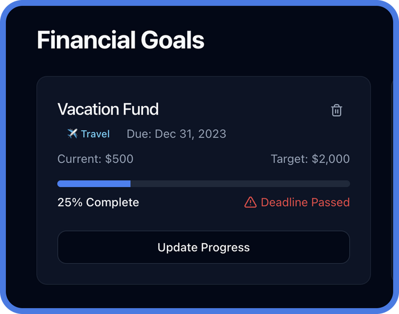 Whether it’s paying off debt or saving for something big, Flowbit keeps you on track with progress indicators and friendly nudges.